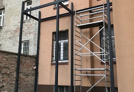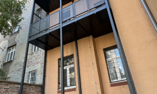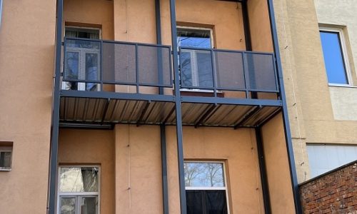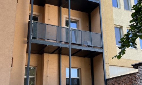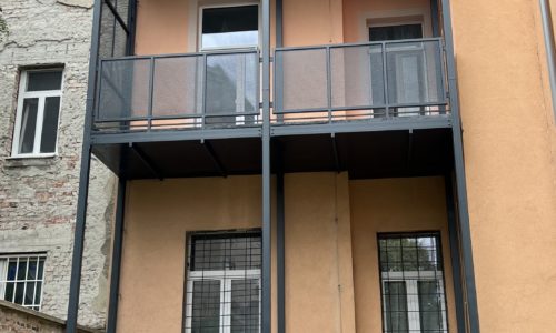 Prístavba balkónových konštrukcii k jestvujúcemu bytovému domu na 2. a 3. nadzemnom podlaží. Nosná konštrukcia je riešená ako oceľová, postavená na železobetónových základových pásoch. Balkónová doska je plecho-betónová. V rámci realizácie sa riešilo aj zaizolovanie podzemnej obvodovej steny bytového domu, výmena okien za balkónové dvere, úprava rozvodov vykurovania a elektroinštalácii. Ostenia a nadpražia nových balkónových dverí boli vyspravené zo strany interiéru omietkou, z exteriéru kontaktným zatepľovacím systémom.